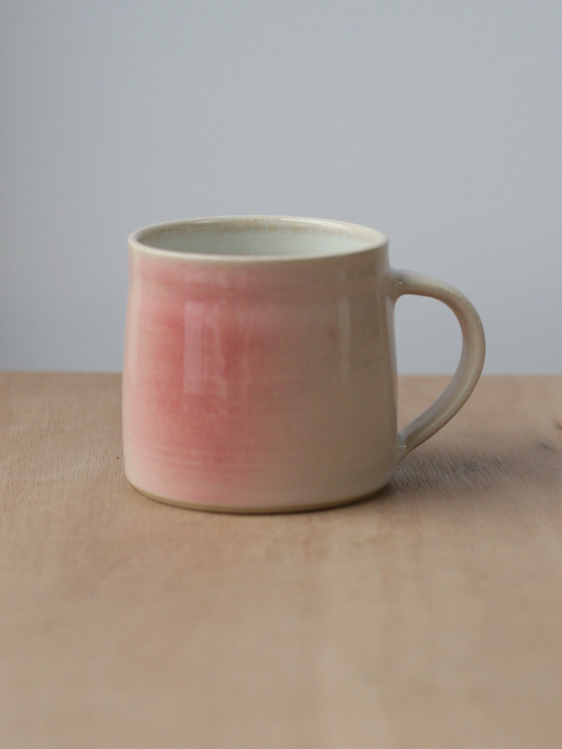 A simple mug, wheelthrown in white stoneware, with a pulled handle. It is glazed in a very pale gloss pink with a lovely blush of darker pink on one side that was created during the kiln firing by placing a tiny amount of chrome nearby. The inside is a glossy titanium white.