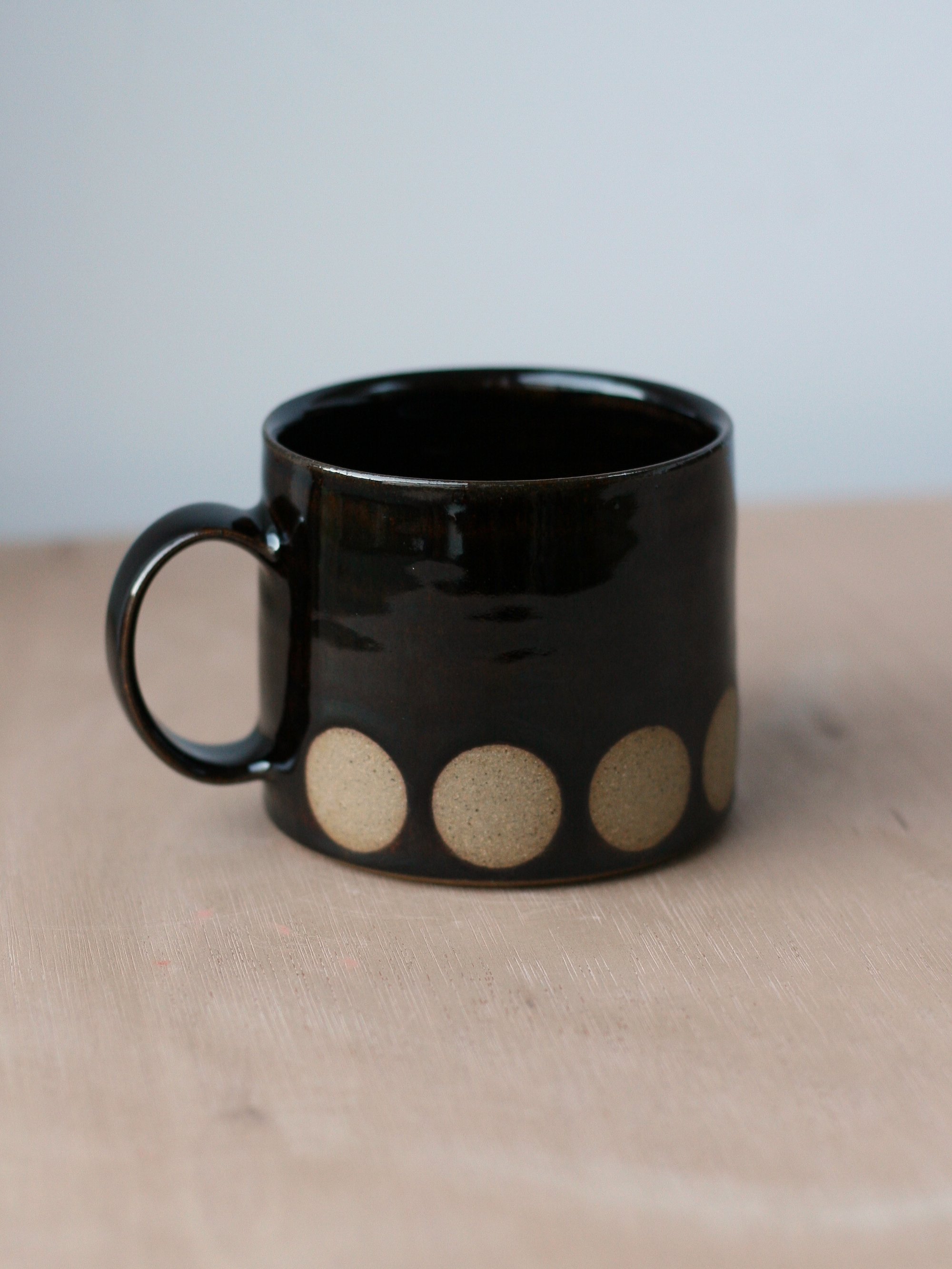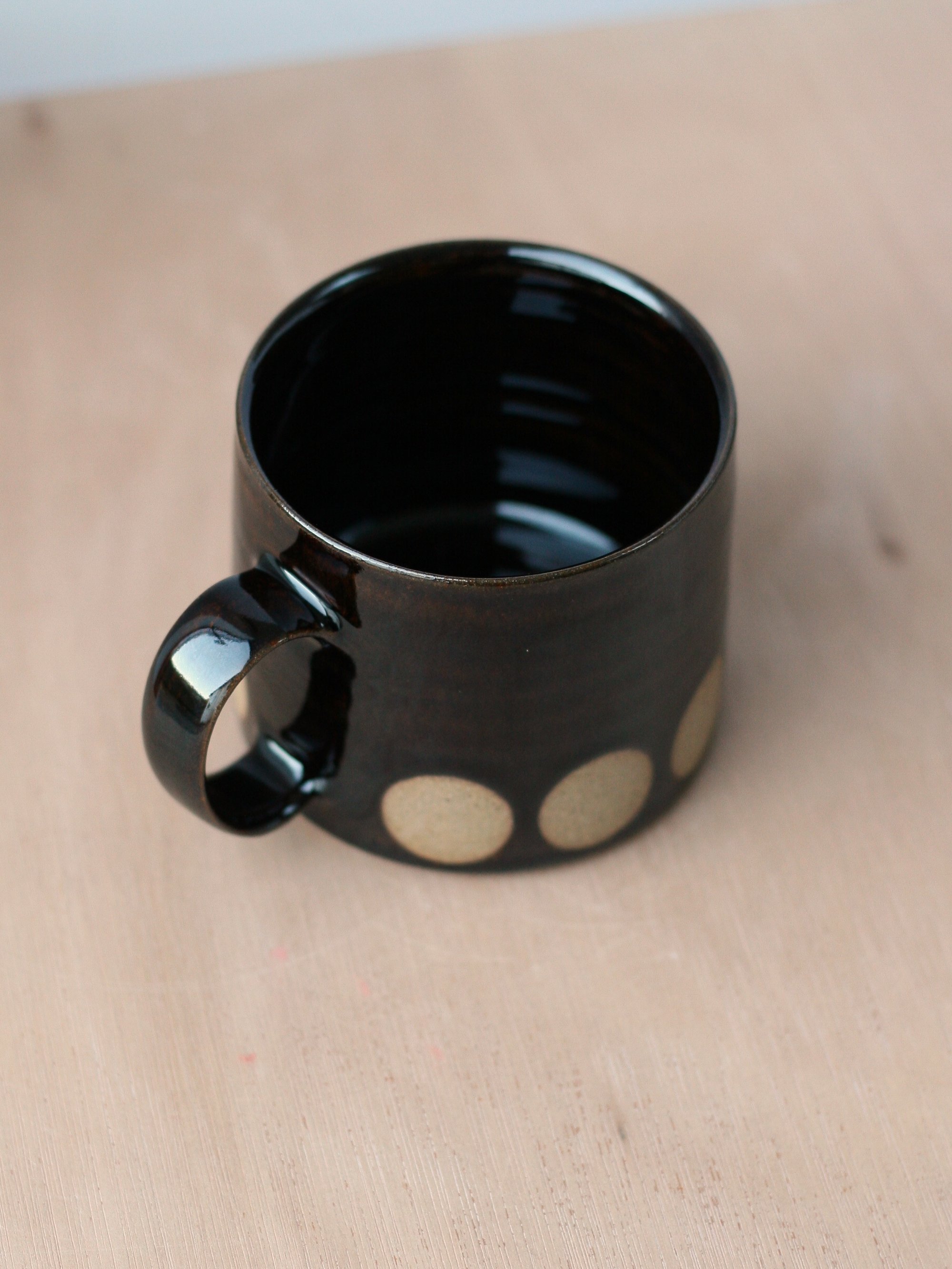 It is glazed in a deep glossy tenmoku that has a lovely amber glow to it when seen in direct sunlight. The circles are left unglazed to show the colour and texture of the clay.