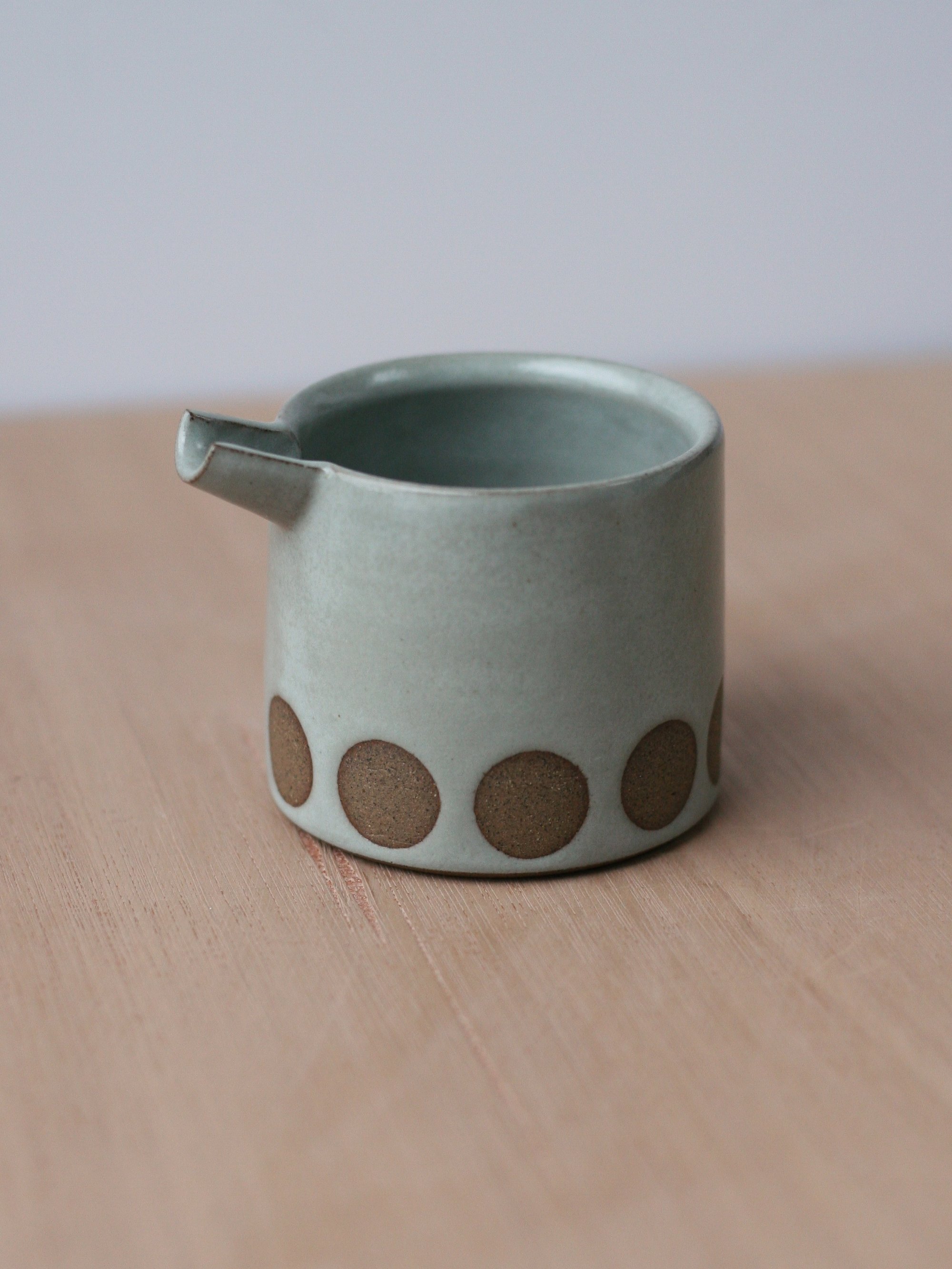 A little pourer, nice for milk or cream. It’s wheelthrown in a blend of dark stoneware clays and glazed in a pale grey-blue with a smooth satin finish. The circles are left unglazed to show the colour and texture of the bare clay.