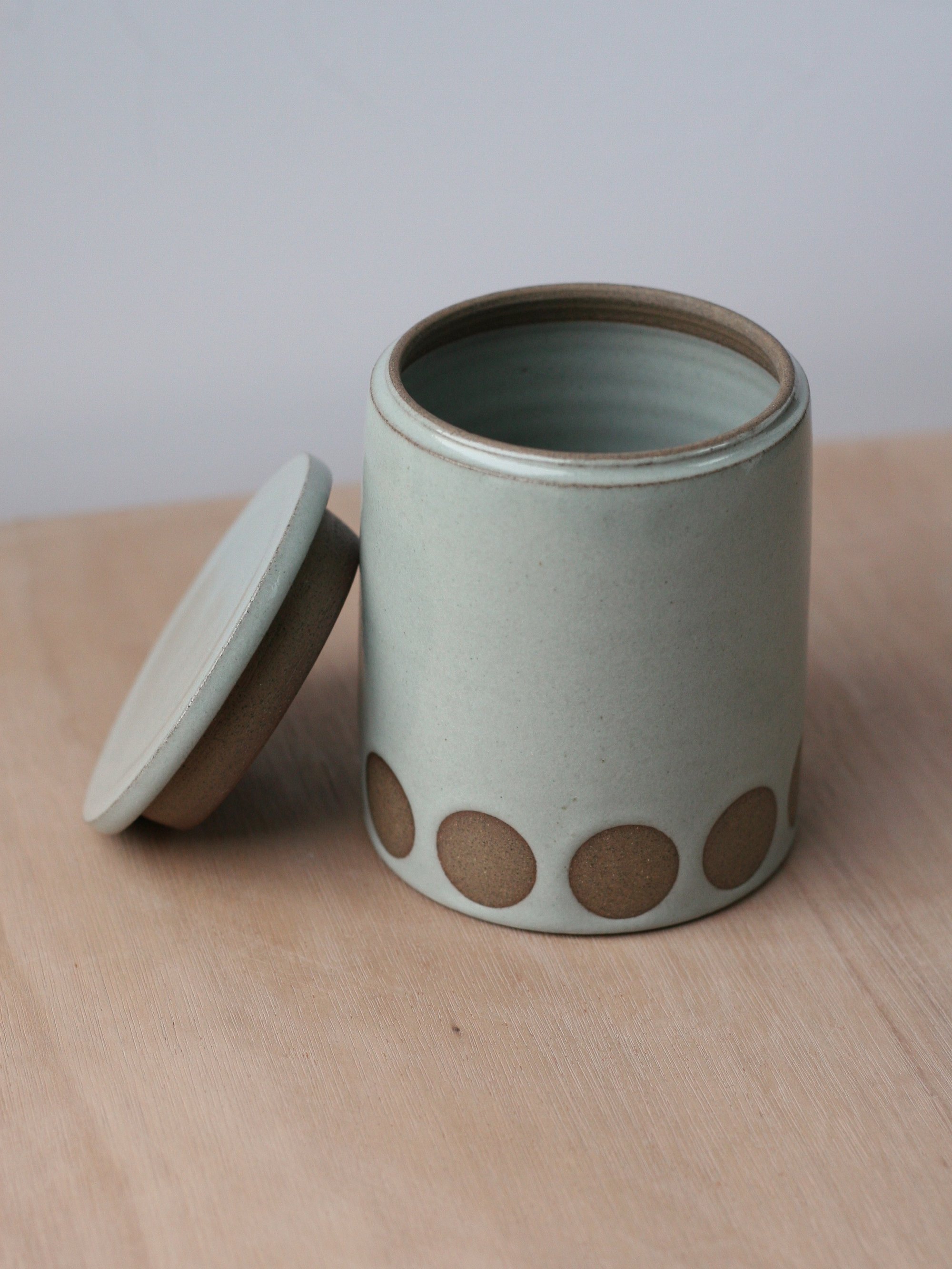 It’s glazed in a pale grey-blue with a smooth satin finish. The circles are left unglazed to show the colour and texture of the bare clay.