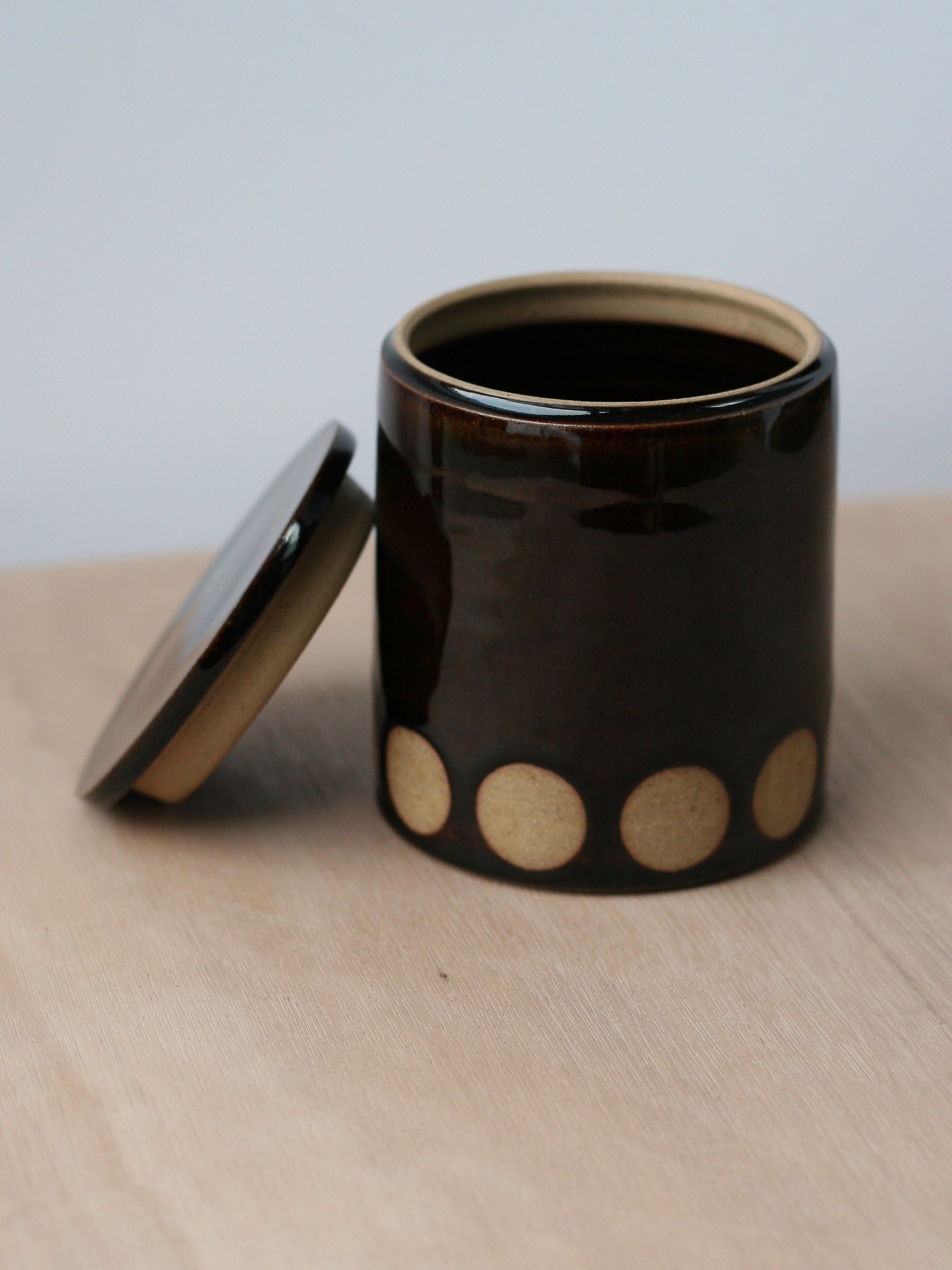 It’s glazed in a deep glossy tenmoku that has a lovely amber glow to it when seen in direct sunlight; the circles are left unglazed to show the colour and texture of the bare clay.