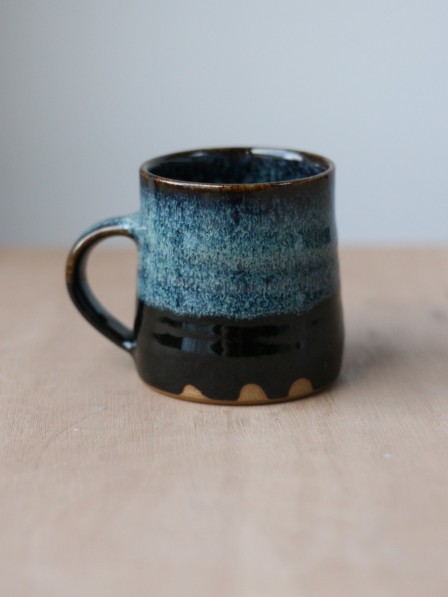 It’s wheelthrown in an iron-rich stoneware, with a pulled handle. It’s glazed in a glossy deep brown-black with a titanium white glaze over, giving a gorgeous ‘floating blue’ effect.