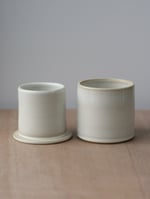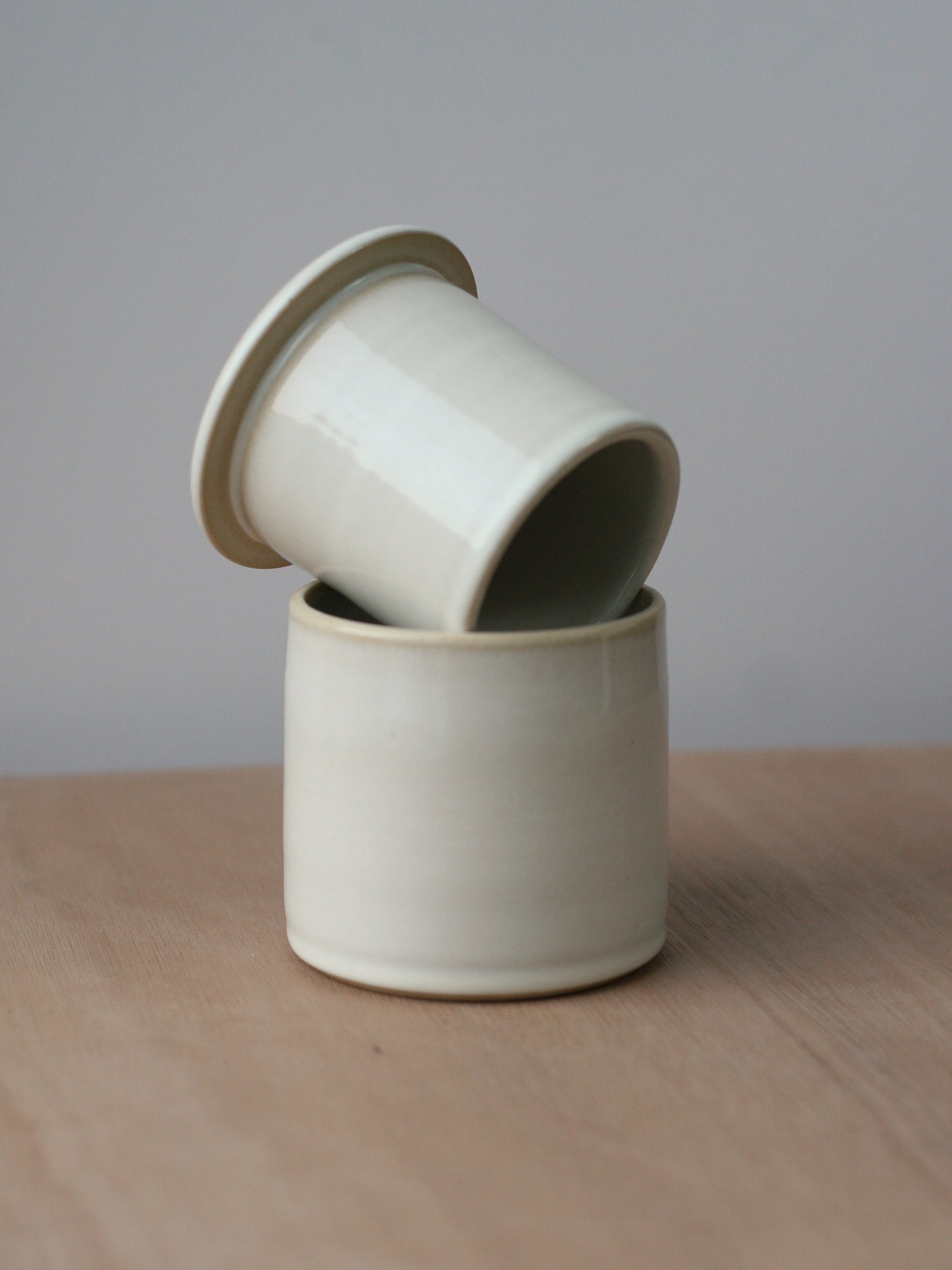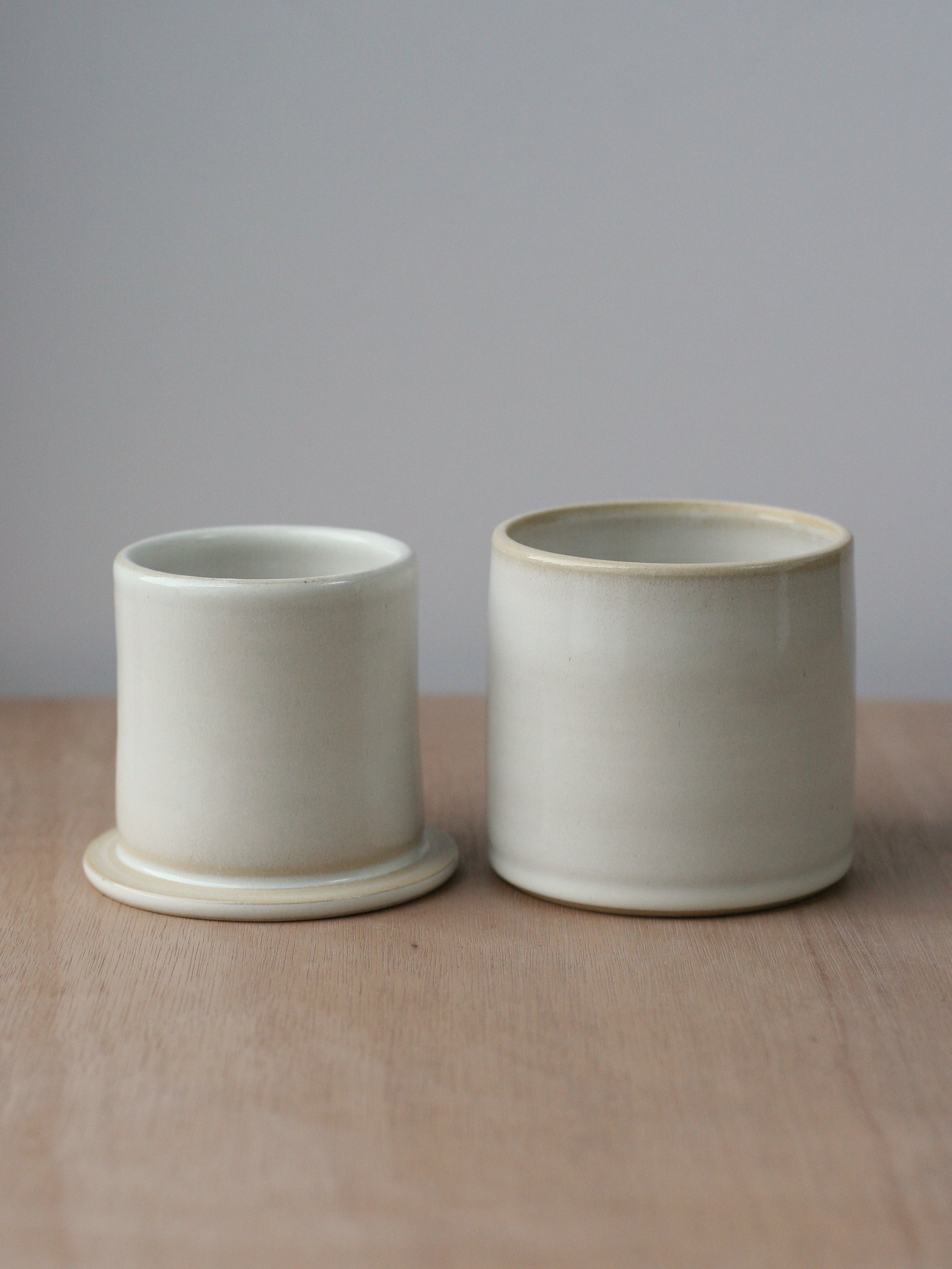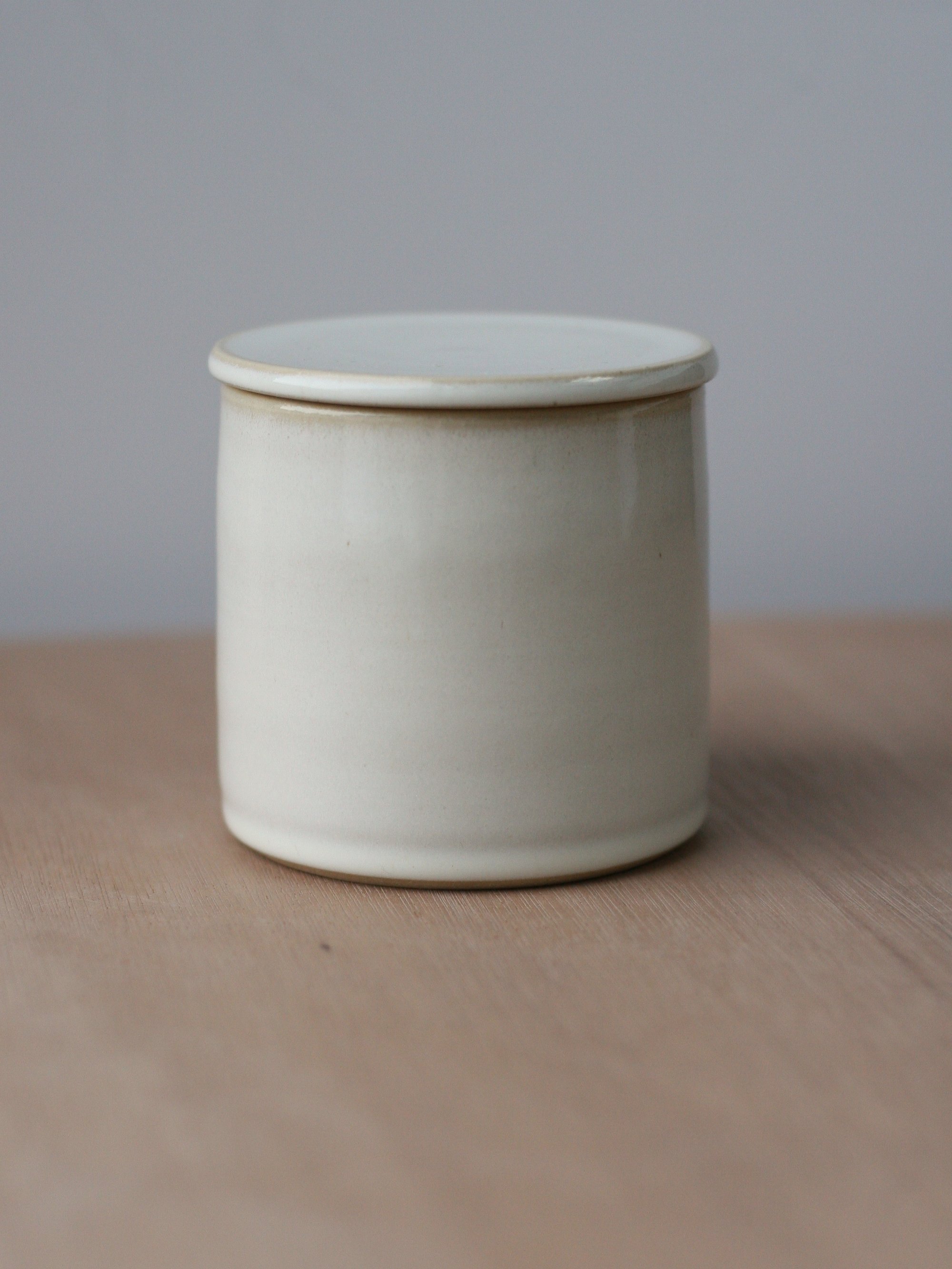 A French butter keeper, wheelthrown in white stoneware. It’s glazed in a glossy titanium white glaze that has a subtle variegation and translucency to it.