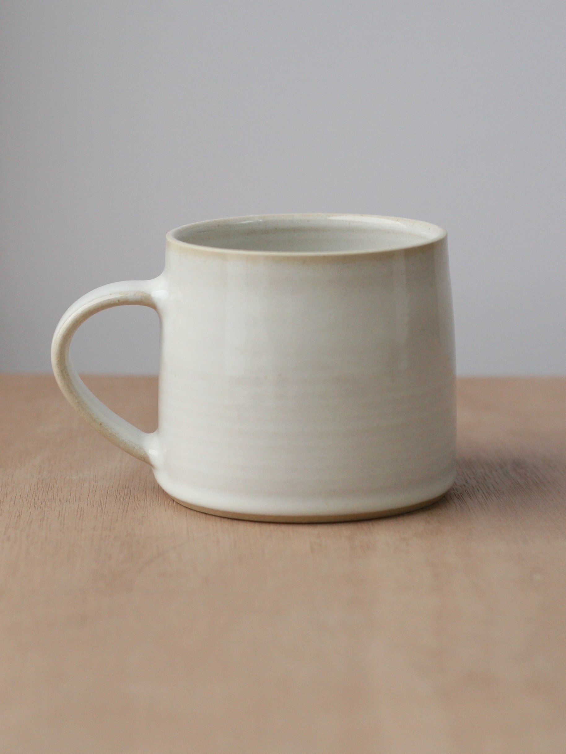It is glazed in a glossy titanium white glaze that has very subtle variegation and interest to it: the glaze ‘breaks’ over edges and texture, gently showing the marks left behind from throwing and turning the mug.