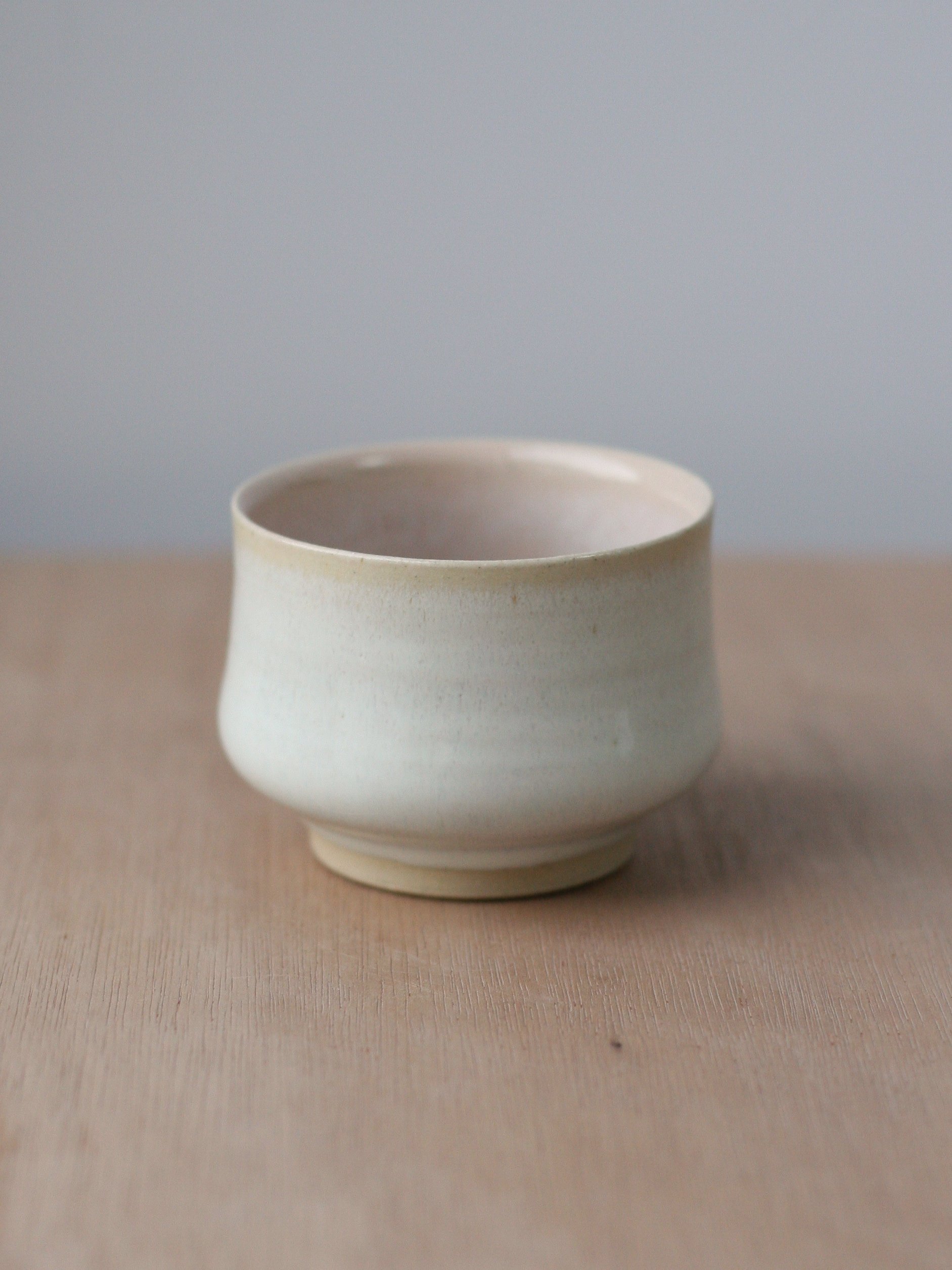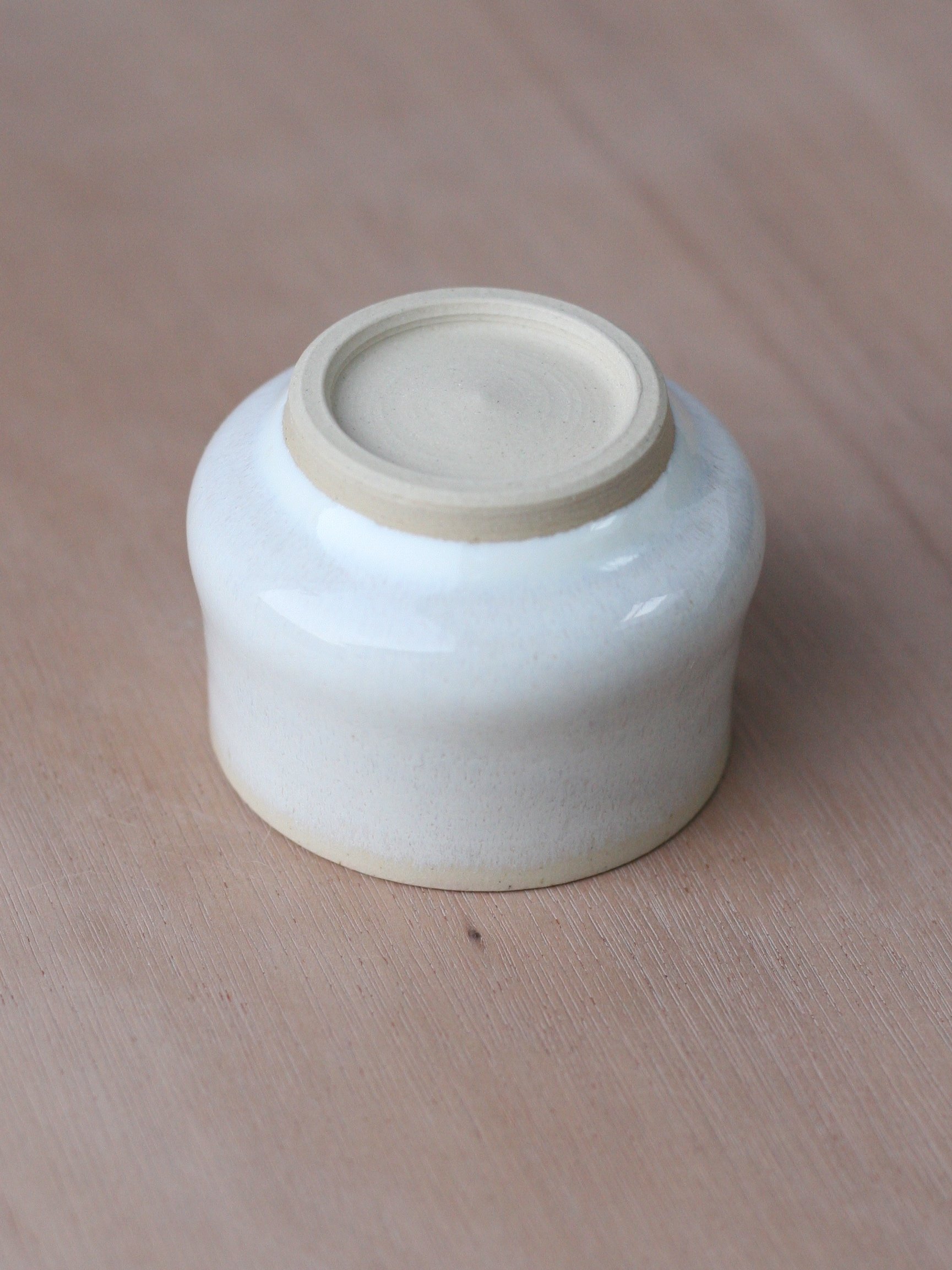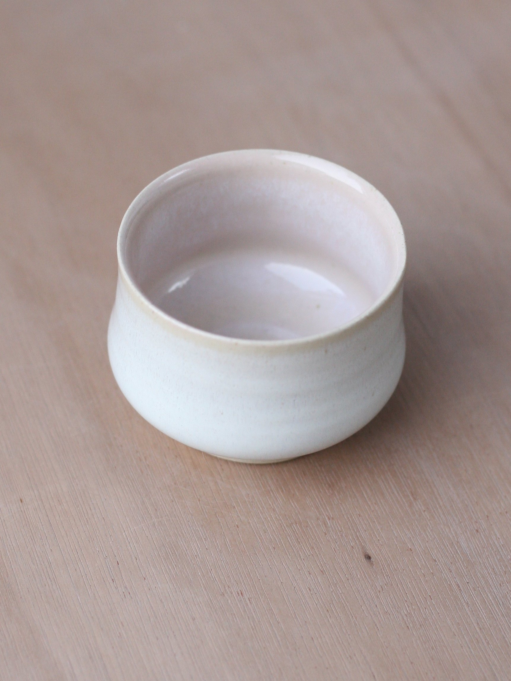 Wheelthrown in white stoneware, and glazed in a titanium white with a very pale shell-like pink inside. Both glazes have a lovely subtle variegation and translucency to them.