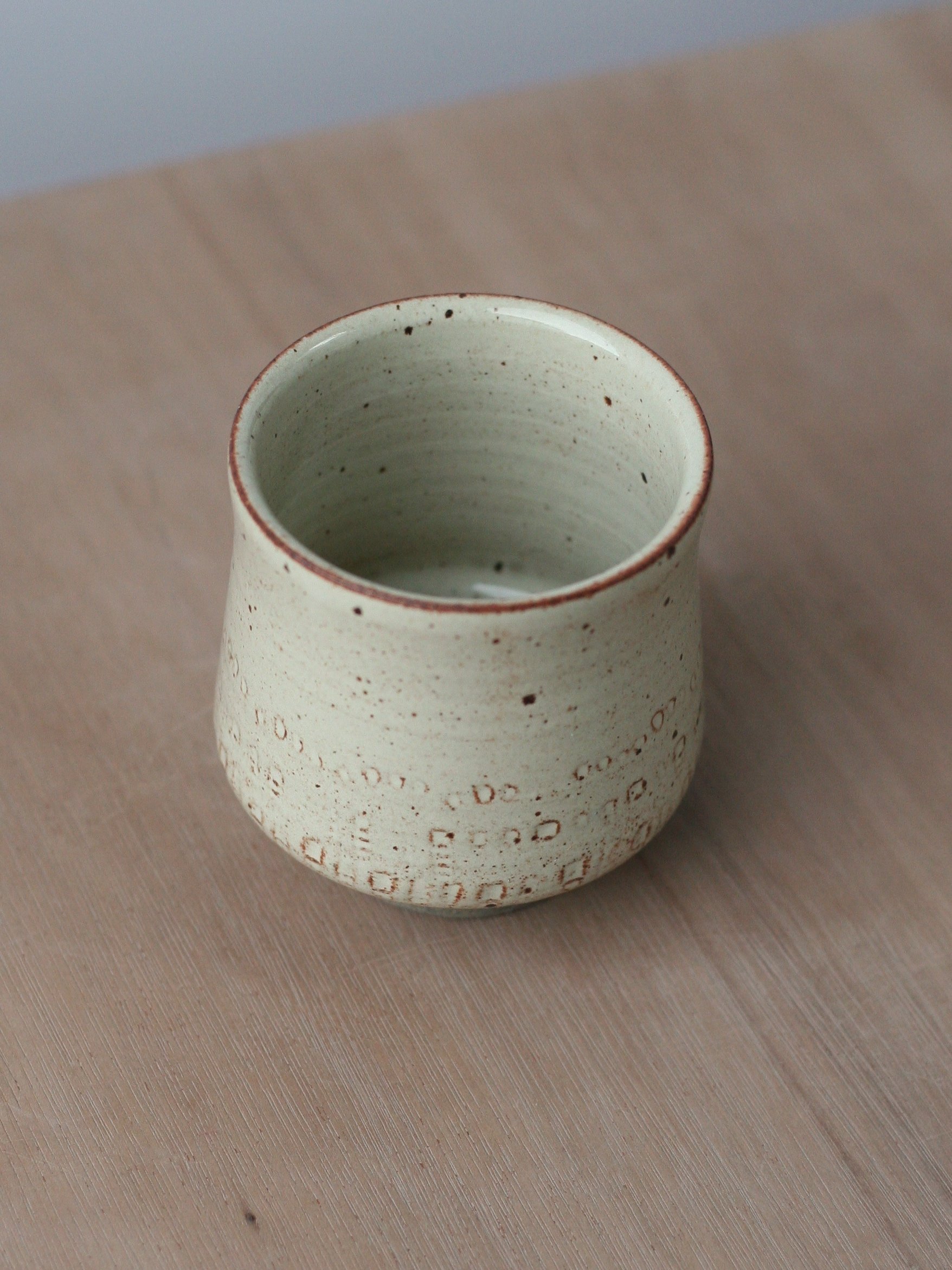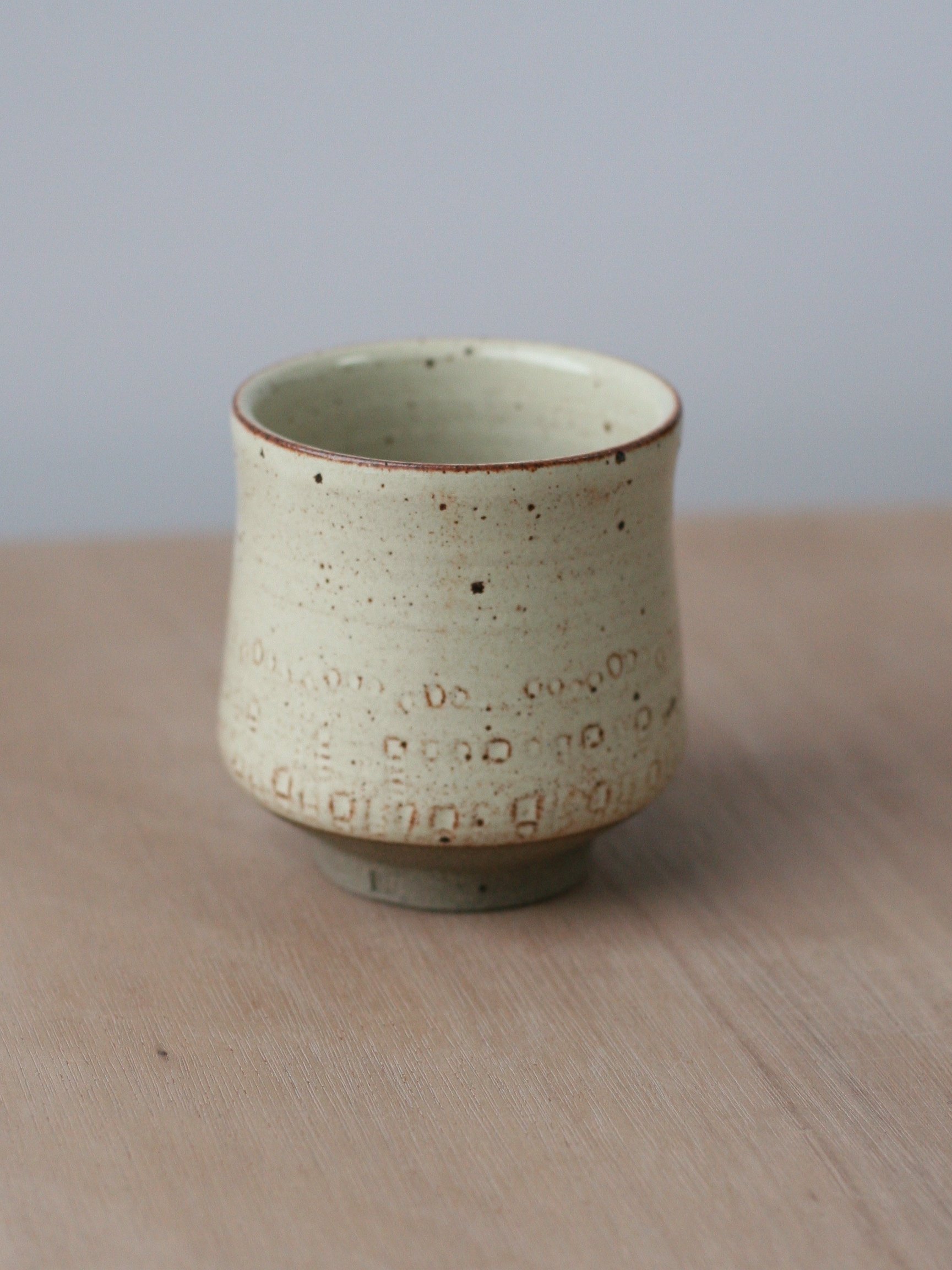 A footed cup, wheelthrown in a grey stoneware blend with a slight fleck. It has impressed details which were made with a shell from the beach in St Andrews, Scotland.